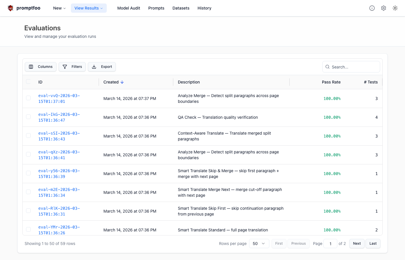 All promptfoo eval tests passed. But running the actual app still translated the entire second page.
